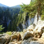 A konstans fesztiváltömegen átverekedve magunkat egy rövid szakaszon a piros, majd az erdőbe jobbra letérve a kék jelzést néztük ki magunknak. Szerencsére nem csak vendéglátás szempontjából fejlődött a környék, hanem a jelzéseket, táblákat is egész szépen rendbe rakták, nem olyan könnyű eltévedni. Nagyjából egy újabb fél óra kellett ahhoz, hogy az első kilátópont felbukkanjon a fenyvesek takarása mögött. Egy darabon még a kék jelzést követtük, majd a célunk elérése érdekében jobbra fordultunk a sárga jelzésre. A Csodavár (Cetățile Ponorului) tulajdonképpen baromi nagy barlang volt valaha, amit annyira kioldott az idők során a víz (lévén ez egy karsztfennsík), hogy egyszer csak nem bírta el a tetején növő sok-sok fenyőfát és magába roskadt. Természetesen a barlang épen maradt részei mai is barlangként funkcionálnak a barlangászok nagy örömére.
