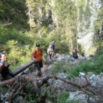 A második napra terveztük be a leghosszabb túránkat. Valójában a szurdok bejáratáig fel lehet menni autóval egy elég hosszú és nem túl jó minőségű murvás úton, de nem akartuk az autókat ilyen megpróbáltatásoknak kitenni, így inkább a régen valaha panzióként működő Éva Mama (Pensiunea La Mamma) házánál raktuk le a gépjárműveket. Innen a sárga jel visz végig, egészen a szurdokig és onnan fel a karsztforrásig, ám az útvonal sétálós része nem túl frekventált, így nem is túlzottan karbantartott (talán épp azért, mert a legtöbben felmennek kocsival). Már eleve az út kezdetének megtalálása is kihívást jelentett a susnyás és a kidőlt fák között, de végül sikerült elindulnunk a megfelelő ösvényen.